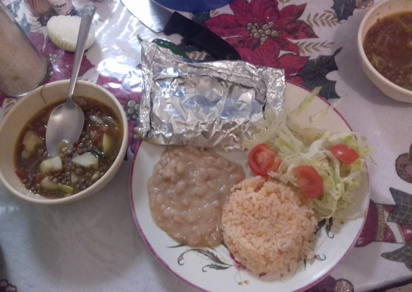 - Para servir poner lentejas en un plato hondo, luego en un plano el molote o envoltorio, arroz, frijoles y ensalada. Llevar a la mesa y comer con salsa picante y bolillos.