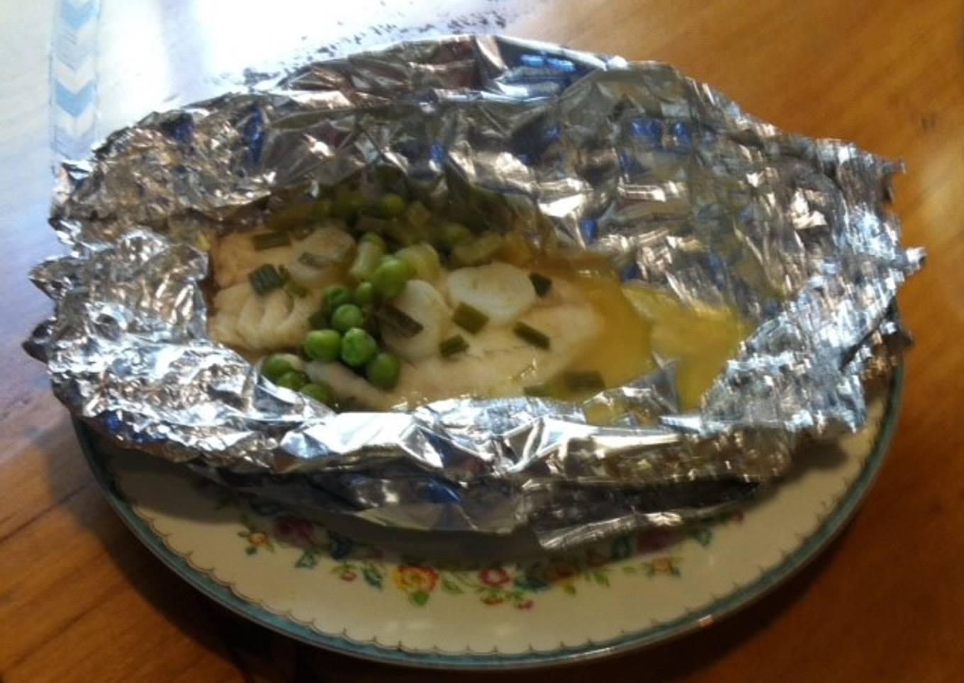 - Colocamos el filete de pescado le ponemos ajo en polvo, sal y pimienta, encima le ponemos cebollitas de cambray -cebollinos- picadas, unos chícharos congelados, un trocito de mantequilla y un chorrito de vino blanco. Cerramos nuestros paquetitos y los ponemos en la vaporera 20 minutos.