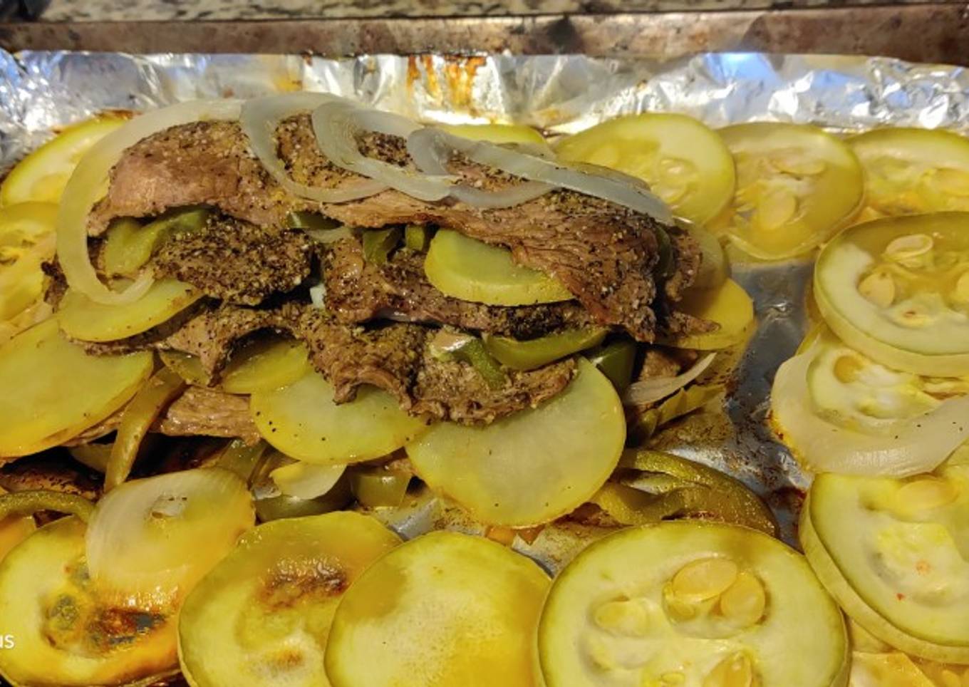 - Pon el papel aluminio en el sartén o charola que meterás al horno. Agrega el aceite en el papel aluminio y baña el piso de la charola con él, enseguida pon el chile morrón, una capa después la carne, después chile, cebolla y la papa.