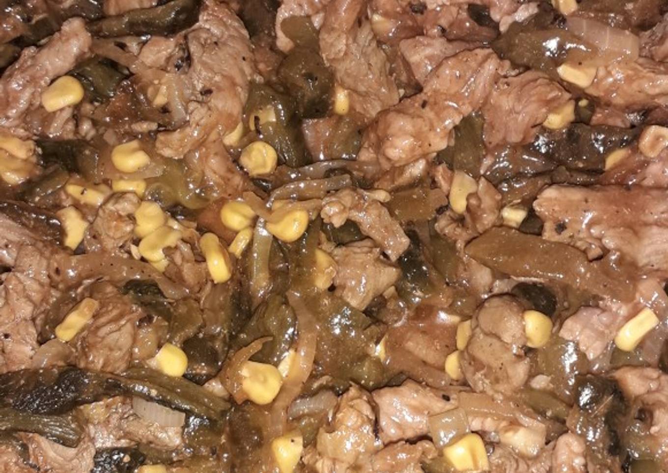 - Ya que la carne redujo el jugo y doro poquito, agrega cebolla, deja 3 minutos agrega rajas y elote, agrega un poquito de sal y pimienta, agrega media taza de puré de tomate, mezcla todo, deja unos 15 minutos moviendo de vez en cuando..