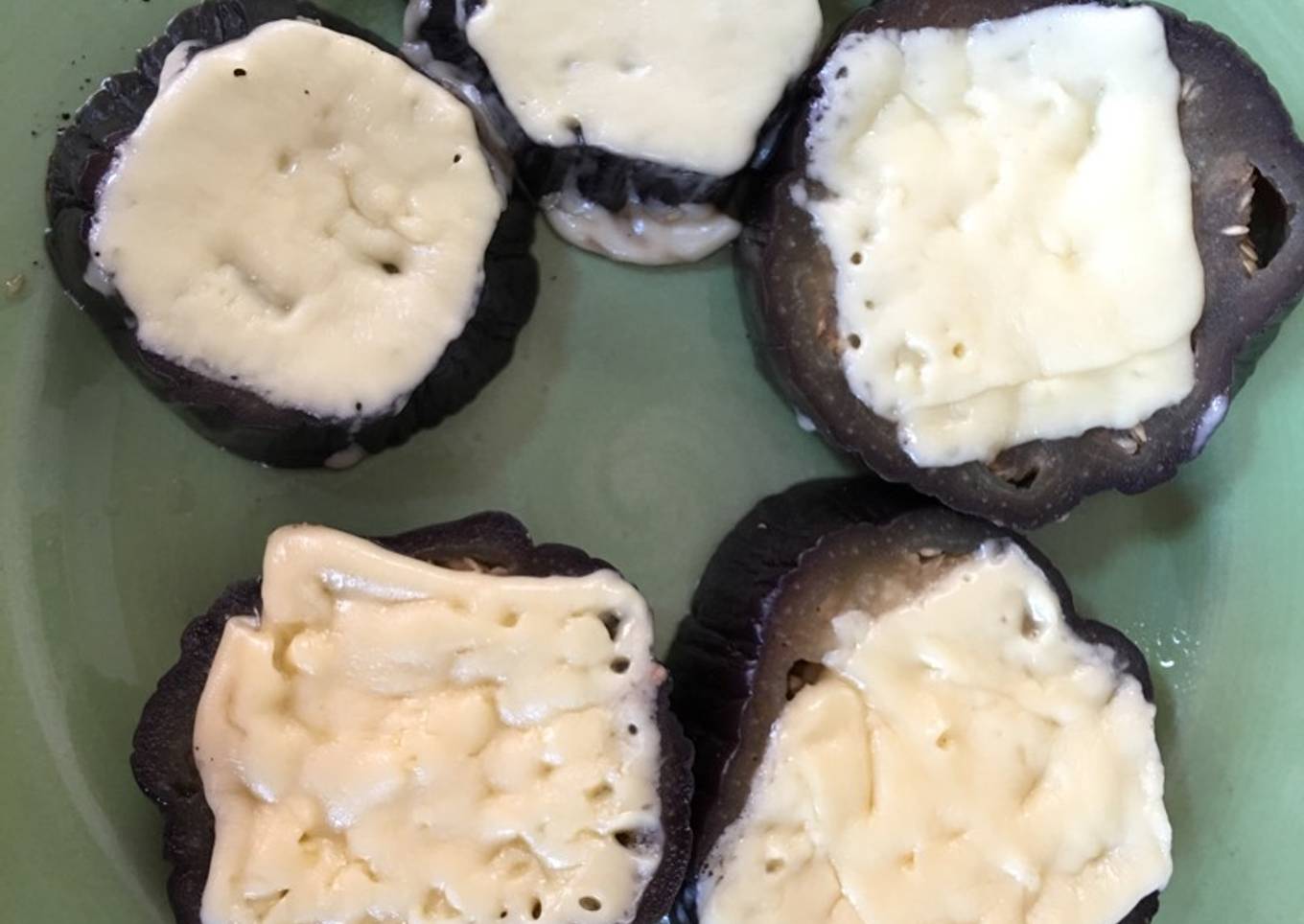 - Voltear las berenjenas y agregar un poco de agua, colocando el queso encima, la sal y pimienta