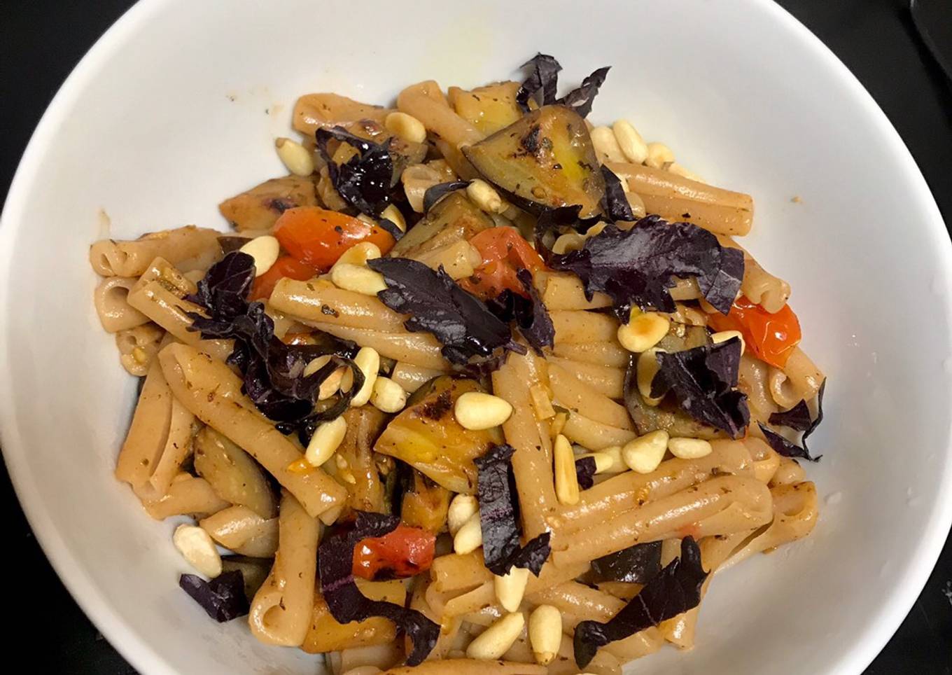 Pasta con berenjena y tomatitos uva