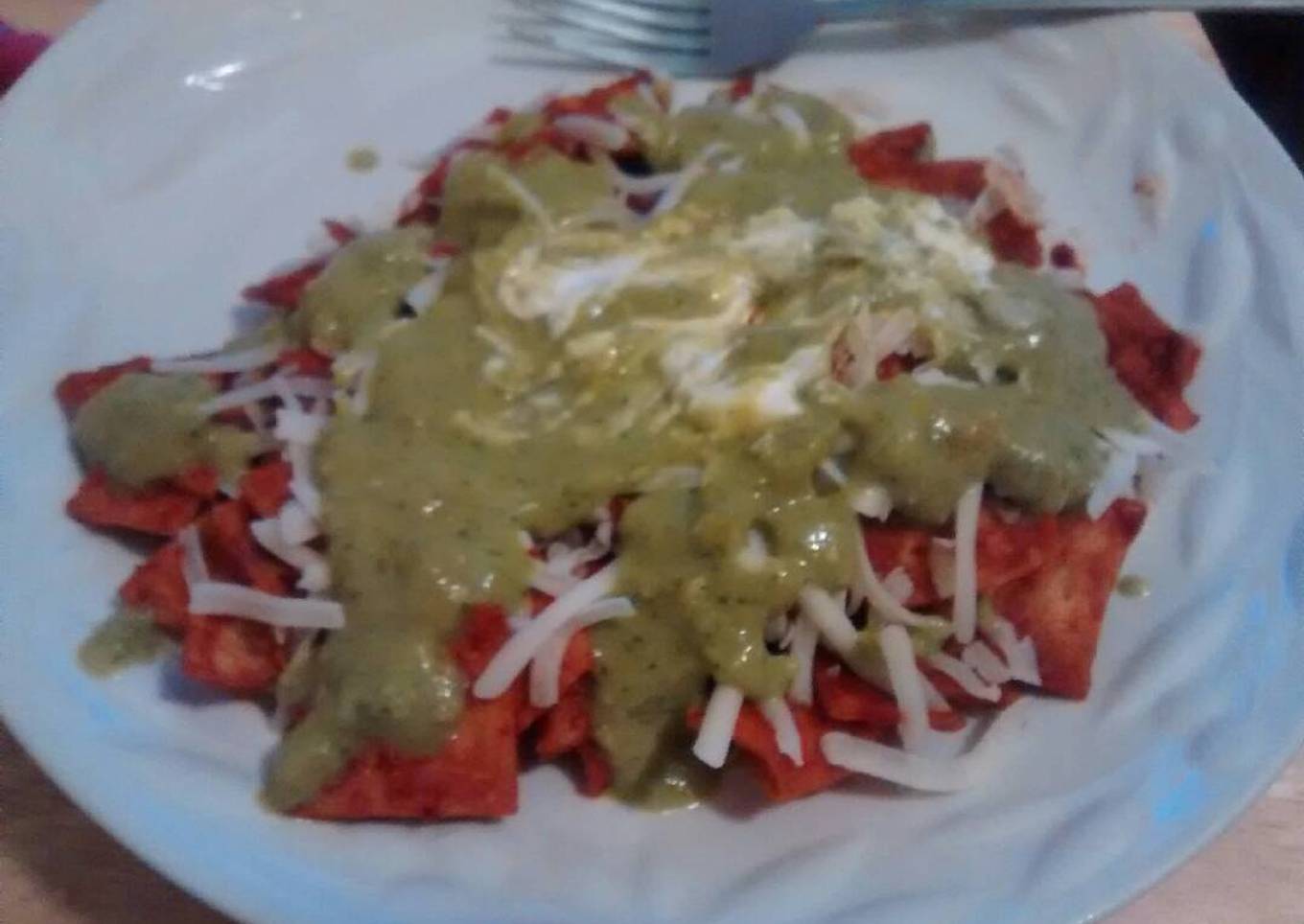 - Aparte se cuecen los chiles ya cocidos se licúan con un poco de agua sal y ajo, se cuela y se guisa en poquito aceite ya guisado el chile se agregan las tortillitas doradas y se revuelven en el chile y listo sirves y acompañas con queso, crema y salsa (es opcional) también puedes acompañar con frijoles refritos.